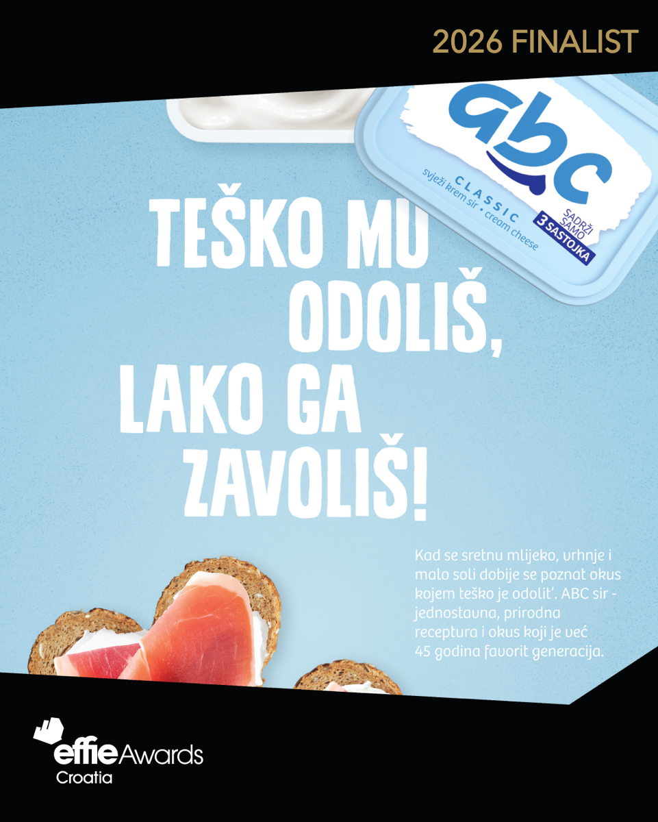 Ponosni smo na kampanju ABC svježeg krem sira Teško mu odoliš, lako ga zavoliš koja je u finalu natjecanja Effie Awards Croatia 2026. u kategoriji hrana!